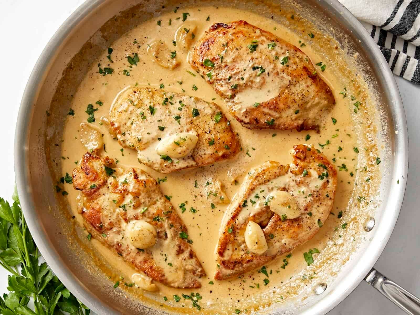 - Finally, return the cooked chicken breasts to the skillet and spoon the creamy sauce over top. Allow the chicken to heat through. Serve with fresh chopped parsley and enjoy!