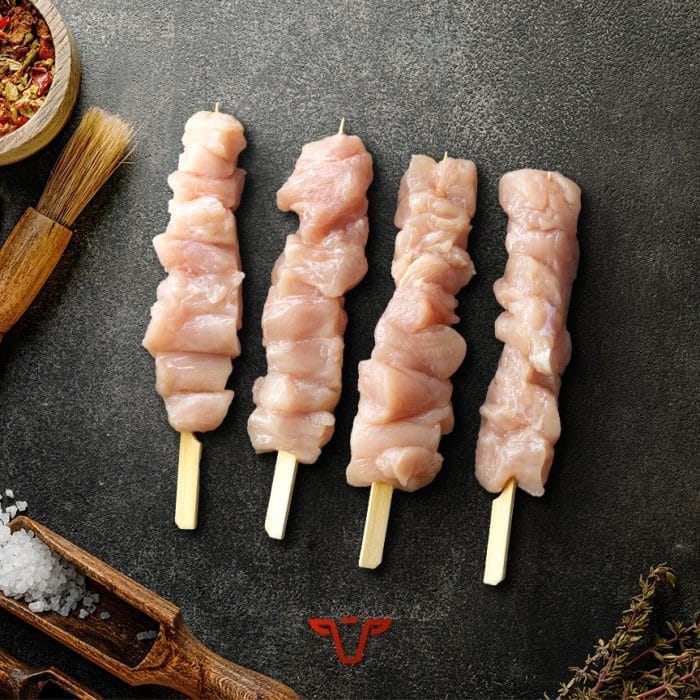 Raw Chicken Shish Breasts are boneless, skinless chicken breasts that are cut into cubes and prepared for skewering and grilling. These pieces of chicken are not marinated or seasoned, allowing for flexibility in flavoring during the cooking process.